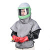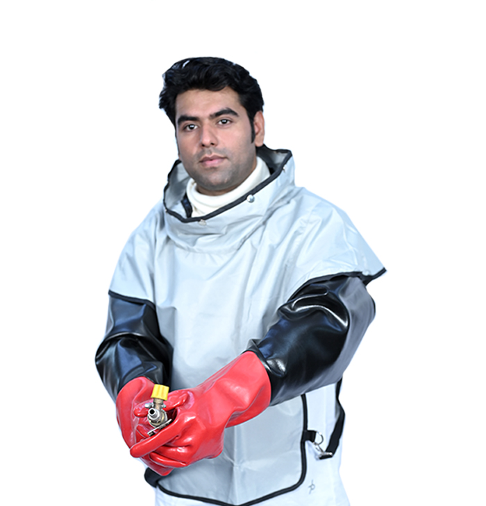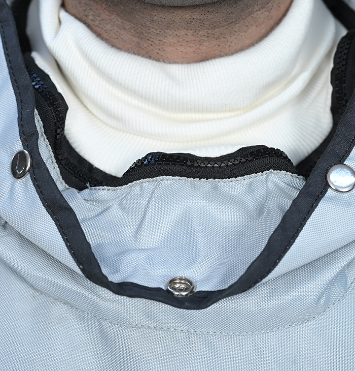 Cape includes an inner collar and bib. The Cape and Bib combo is designed to protect the blaster from getting blasting abrasive and dust inside the suit