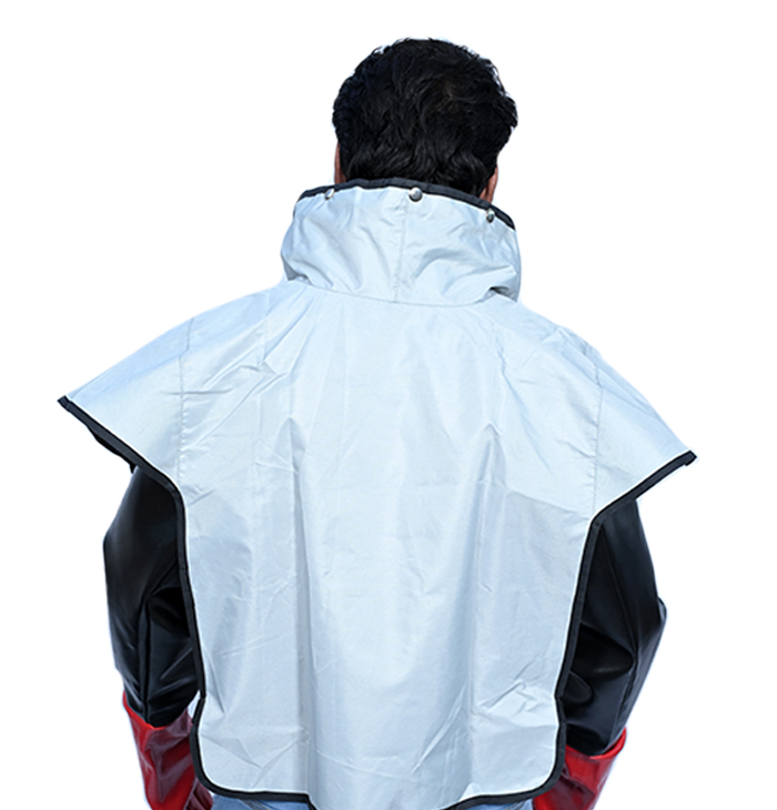 The Cape is made of Nylon with a neck bib made of nylon cotton Rib inside to provide better comfort.