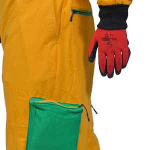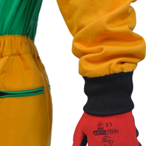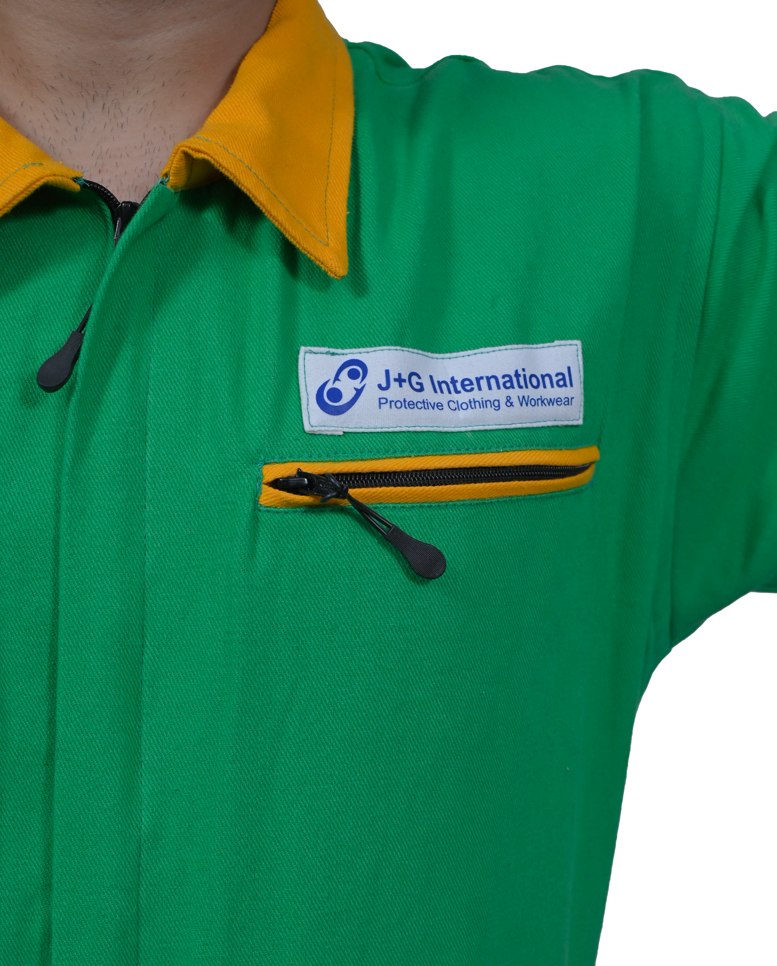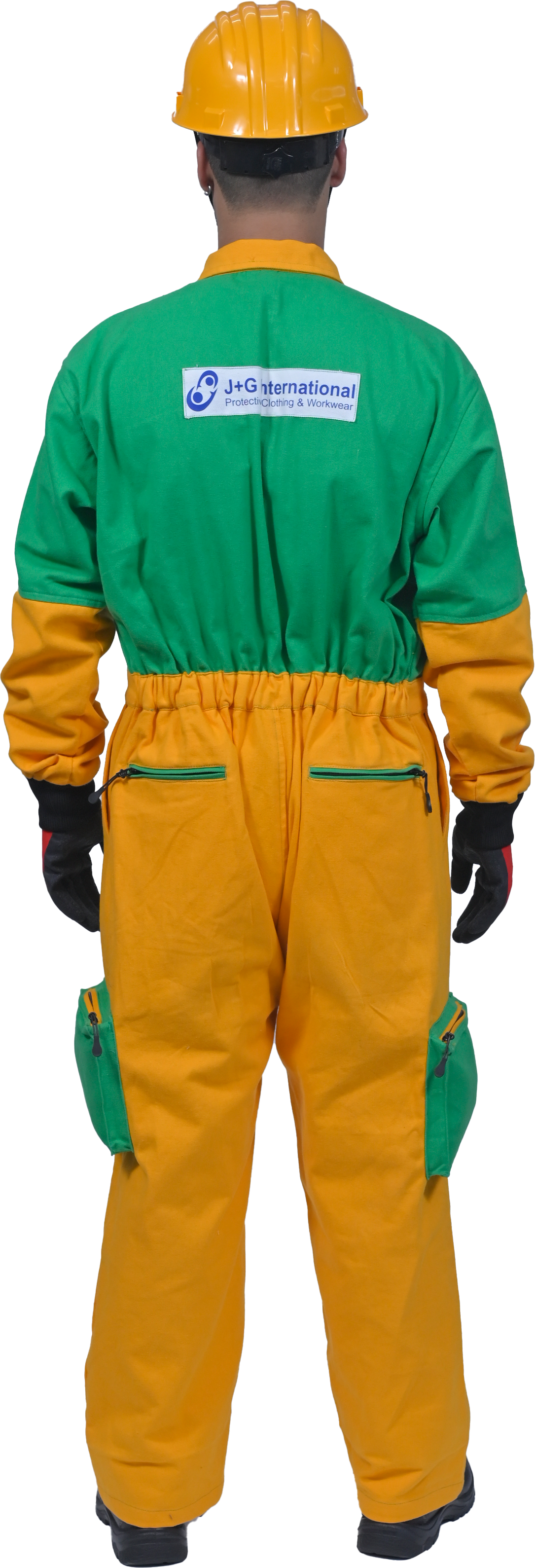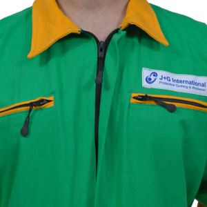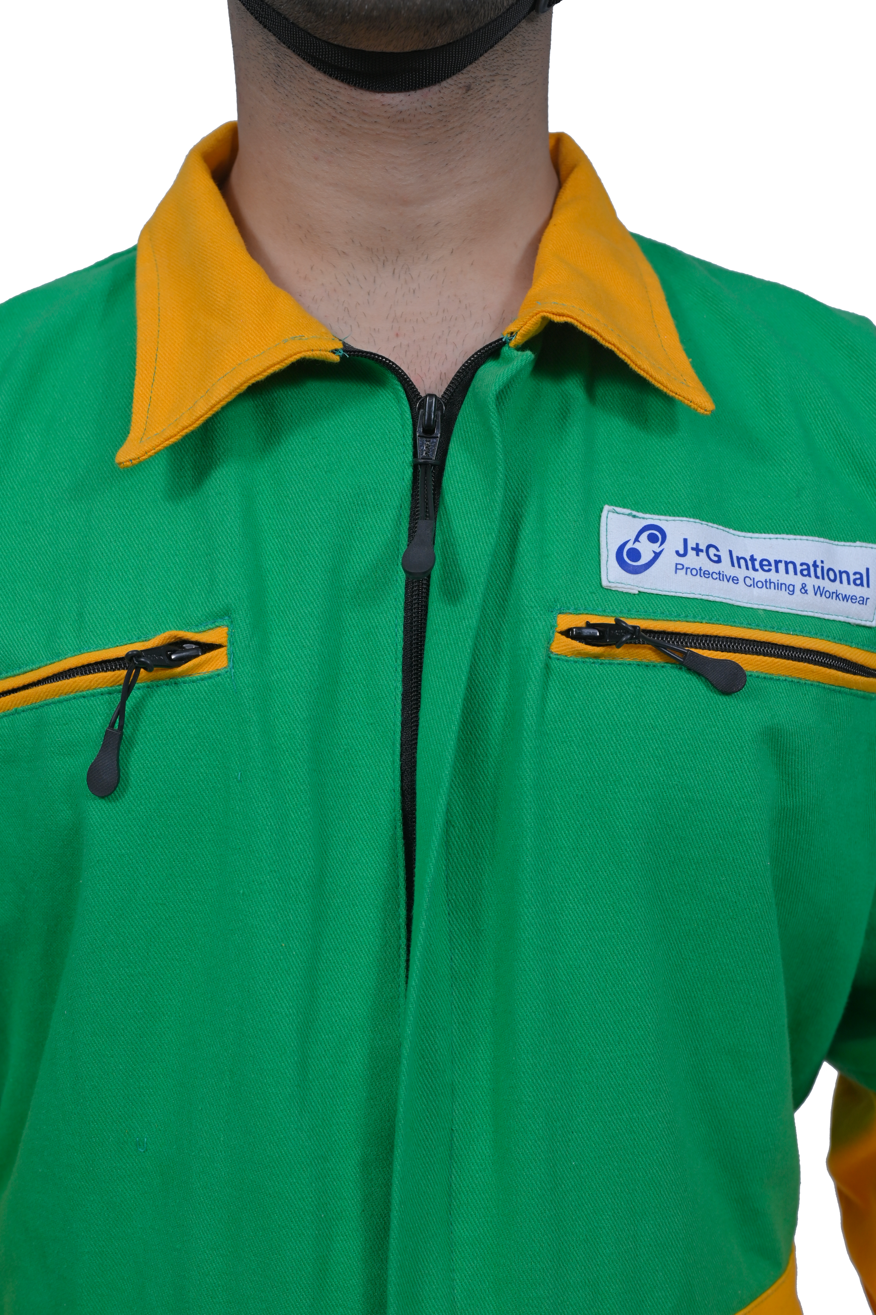 This dual-colored workwear overall is made in 100% cotton fabric. There is a zip in front (till waist down) for closure. It has various pockets with flaps; including two patch pockets on chest with zip closing, two side pockets, two patch pockets on trouser with covering flap. It has full sleeves and there is rib on sleeve end. The fabric is closely knitted to ensure maximum heat dissipation and comfort.