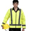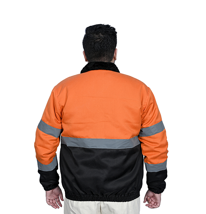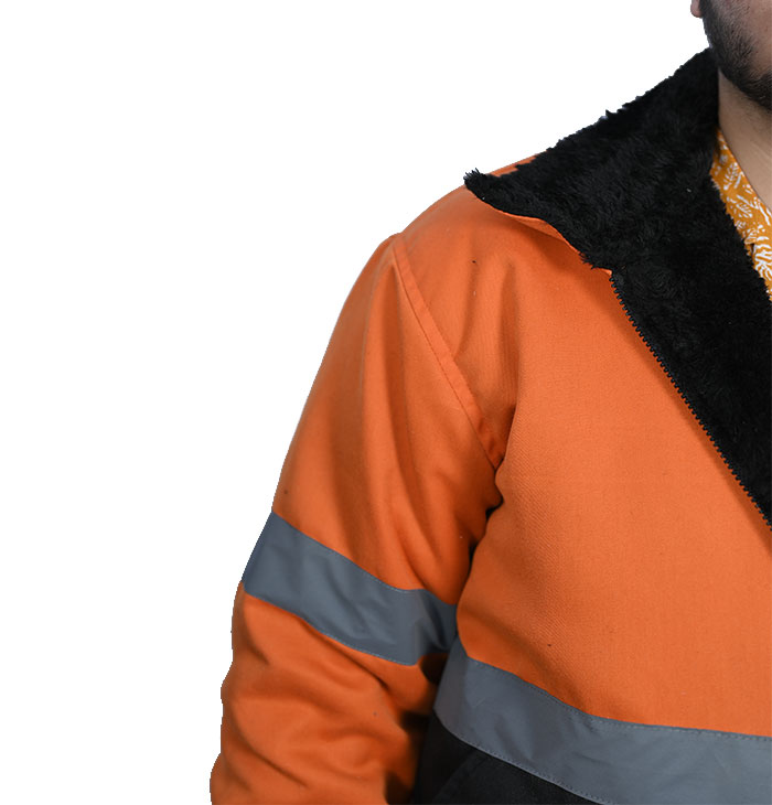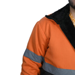 Made of water retardant Polyester/Cotton with heavy fleece lining for cold and wet climates. Work wear that provides light visibility and warmth tape provides a dry and visible garment in rainy, low-light conditions. The zip polar fleece sweatshirt along with a heavy weight polar fleece collar allows for an adaptable jacket suitable for walk-in coolers and freezers.