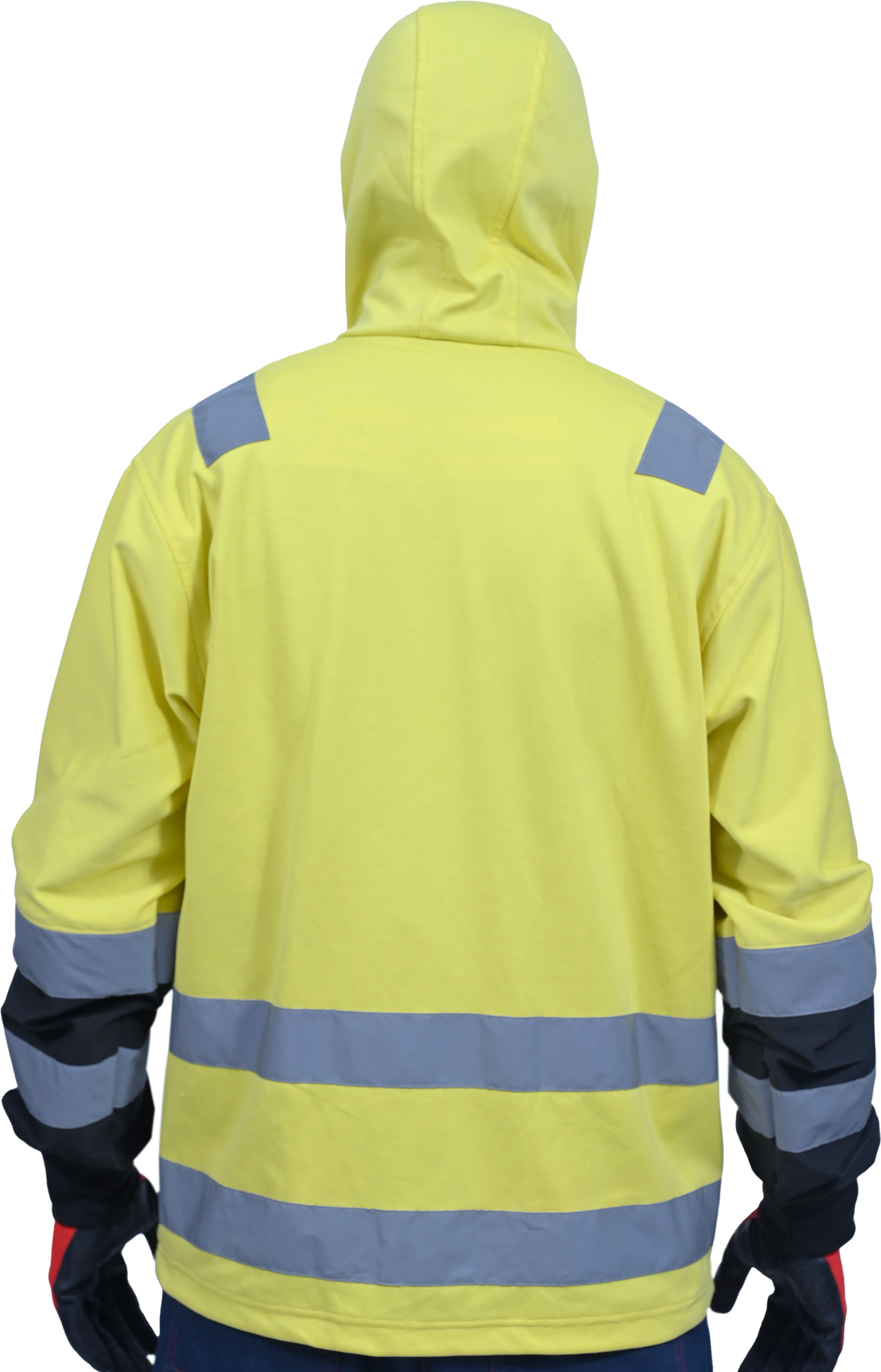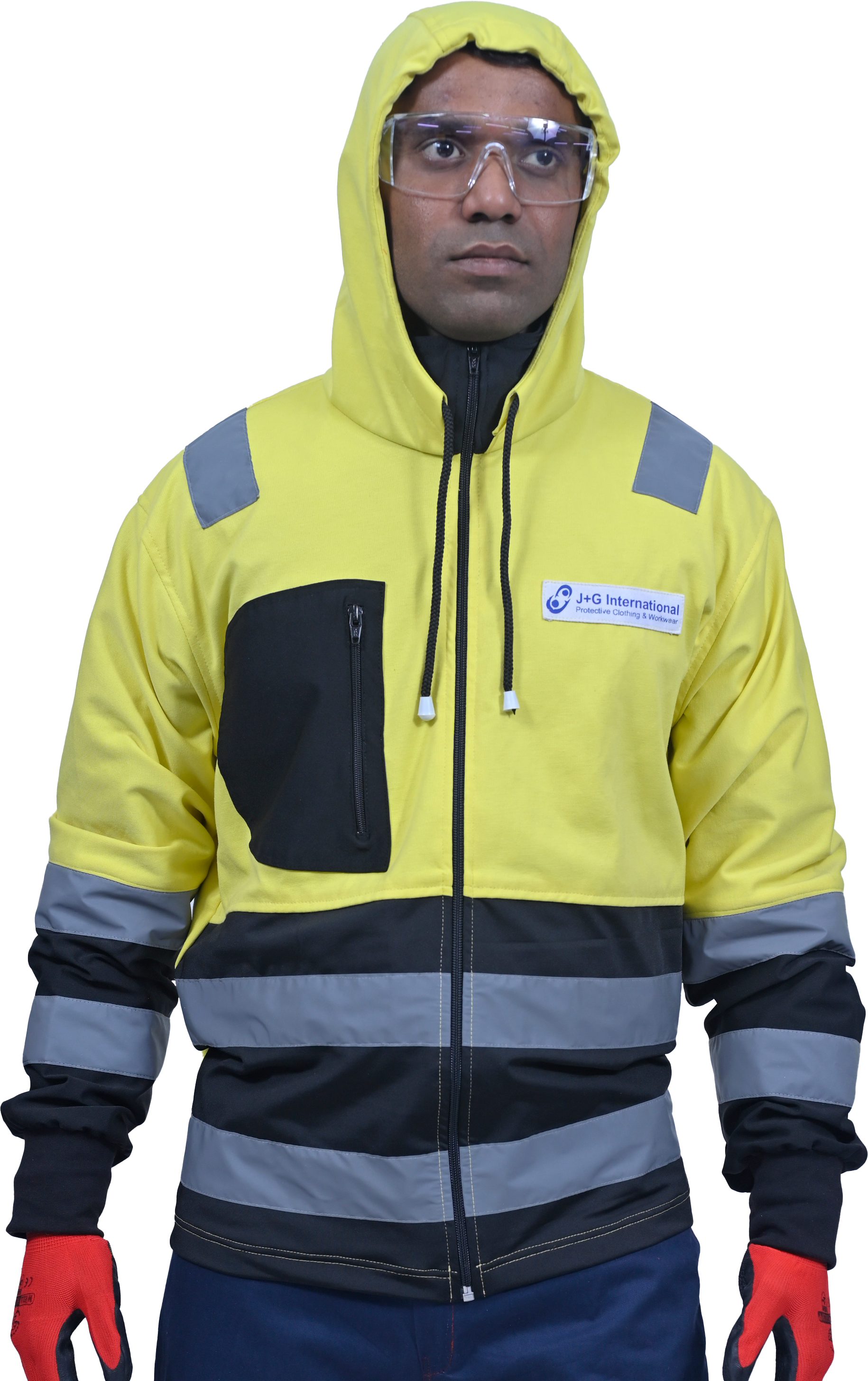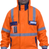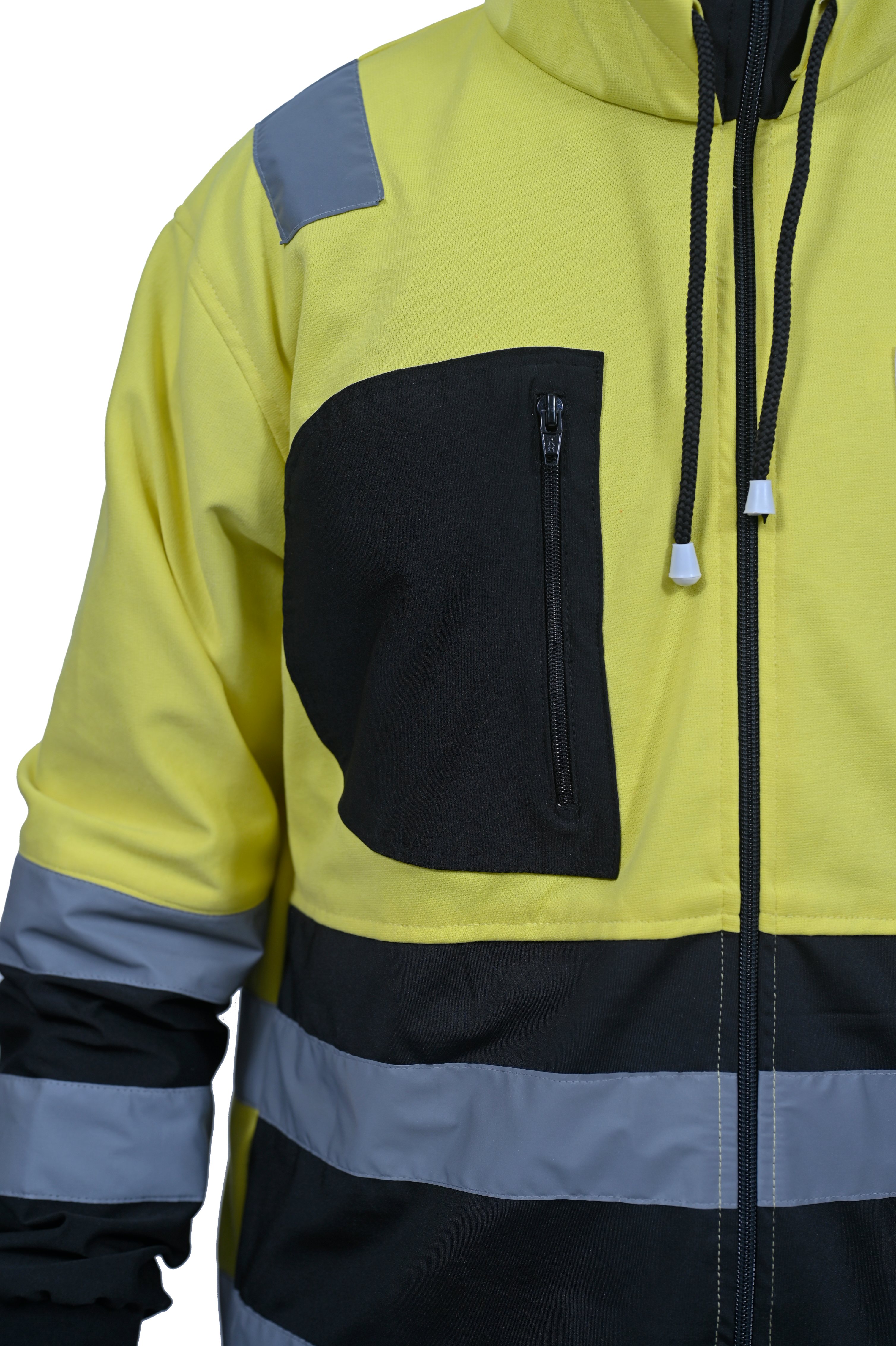 Hi-visibility jacket with adjustable draw cord in hoodie. Round collared in knitted stretch fabric for greater comfort. With reflective rib on arm for good fit. made of polyester cotton in dual color option has an inverted ‘D’ trendy pocket in Front along with full front zip closure.