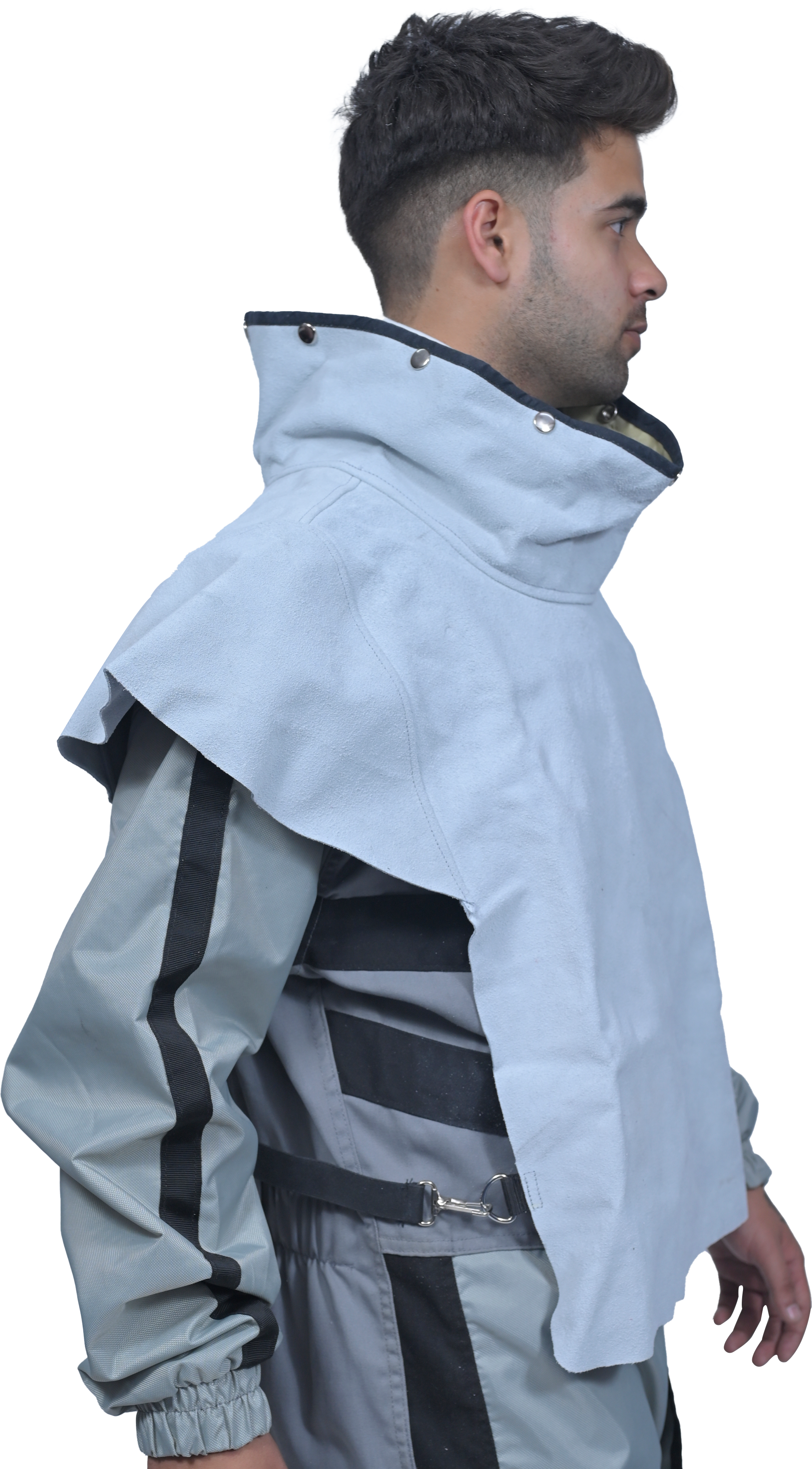 The cape is made in leather which is very comfortable for the operator. It attaches directly to the helmet using strong press studs. This allows easy removal by the operator but will not come off accidentally. It is soft and more durable compared to the other variants. The cape has a black piping on the neck to increase wear-tear resistance. It also forms a tight seal to prevent dust from entering the respirator.