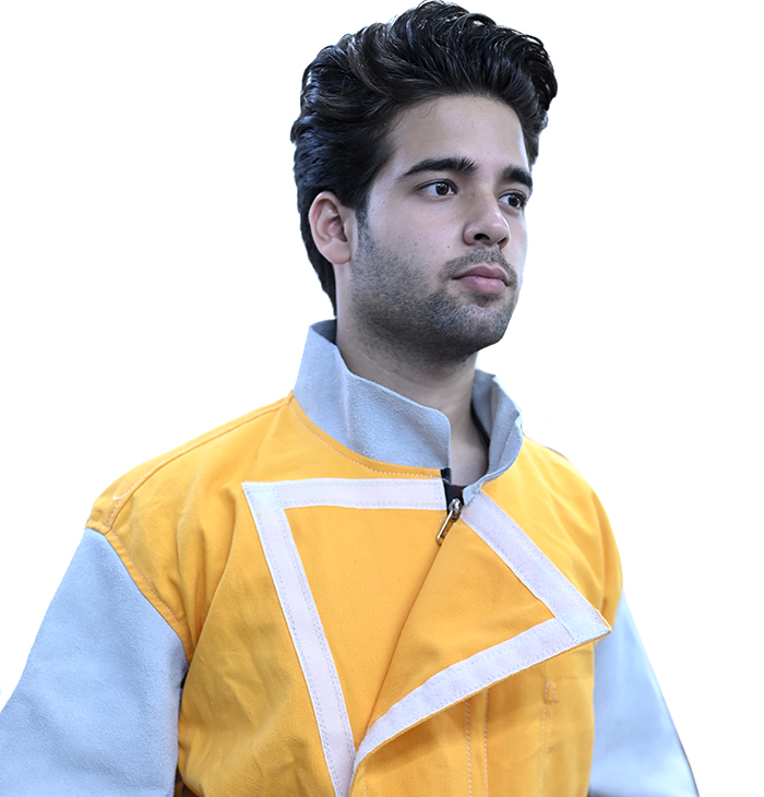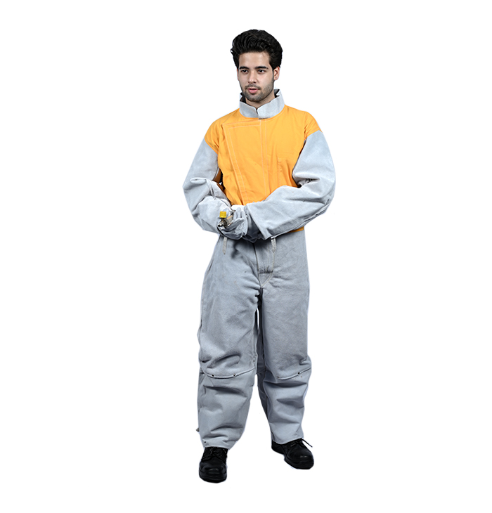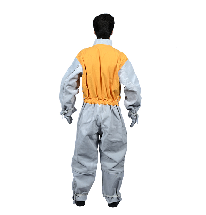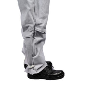 These Overalls have leather in front and back from waist down ward and cotton from waist upward. The closing is with Hook & Loop at the top and Nylon Zip underneath.