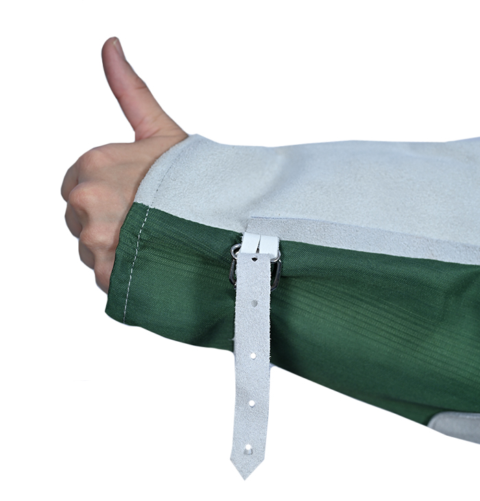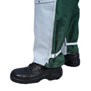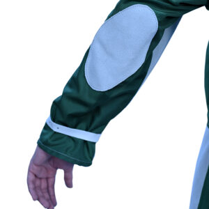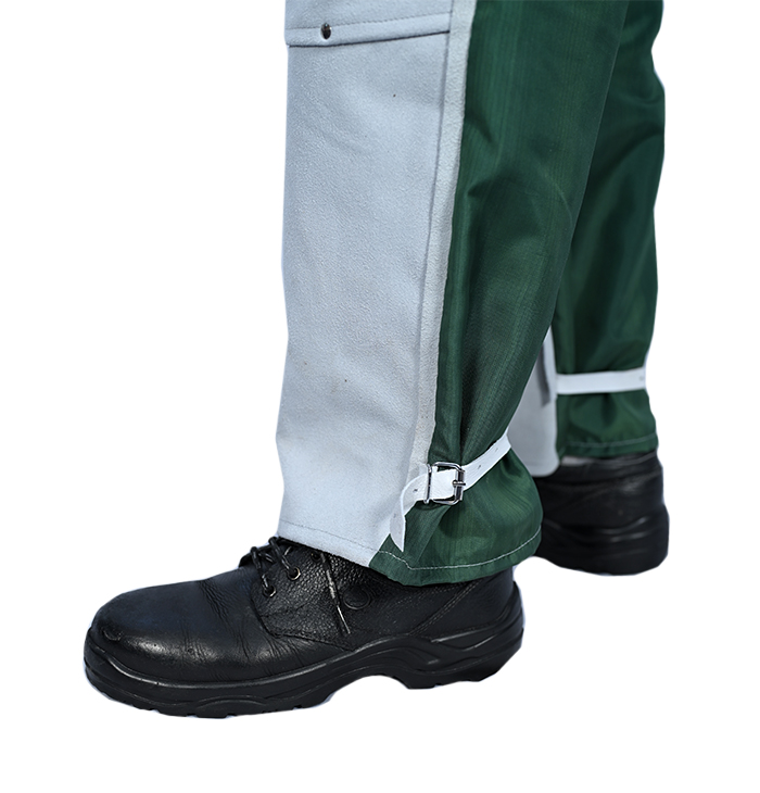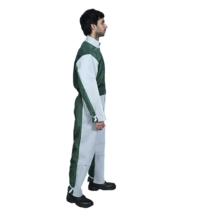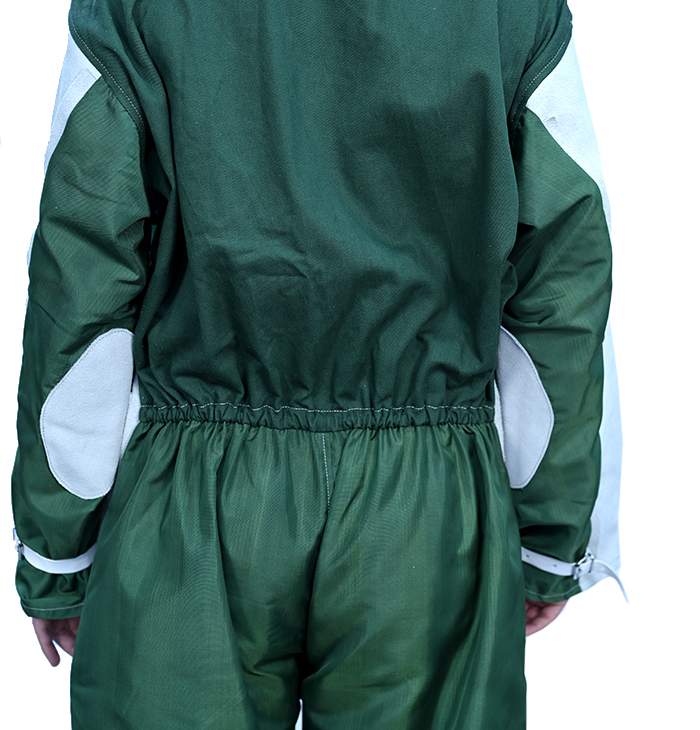 Nylon is used on the Chest portion, and on the back side for easy and comfortable movement. Two large leather patch pockets are provided on the back side, if required. The collar is of softer, split leather. We provide double closing at front. It is with snap buttons underneath and Hook & Loop or Snap Button at the top. For tightening at wrists and legs, we use Nylon strap with Hook & Loop &Buckle or Leather straps with Buckles as required by the Buyers.
