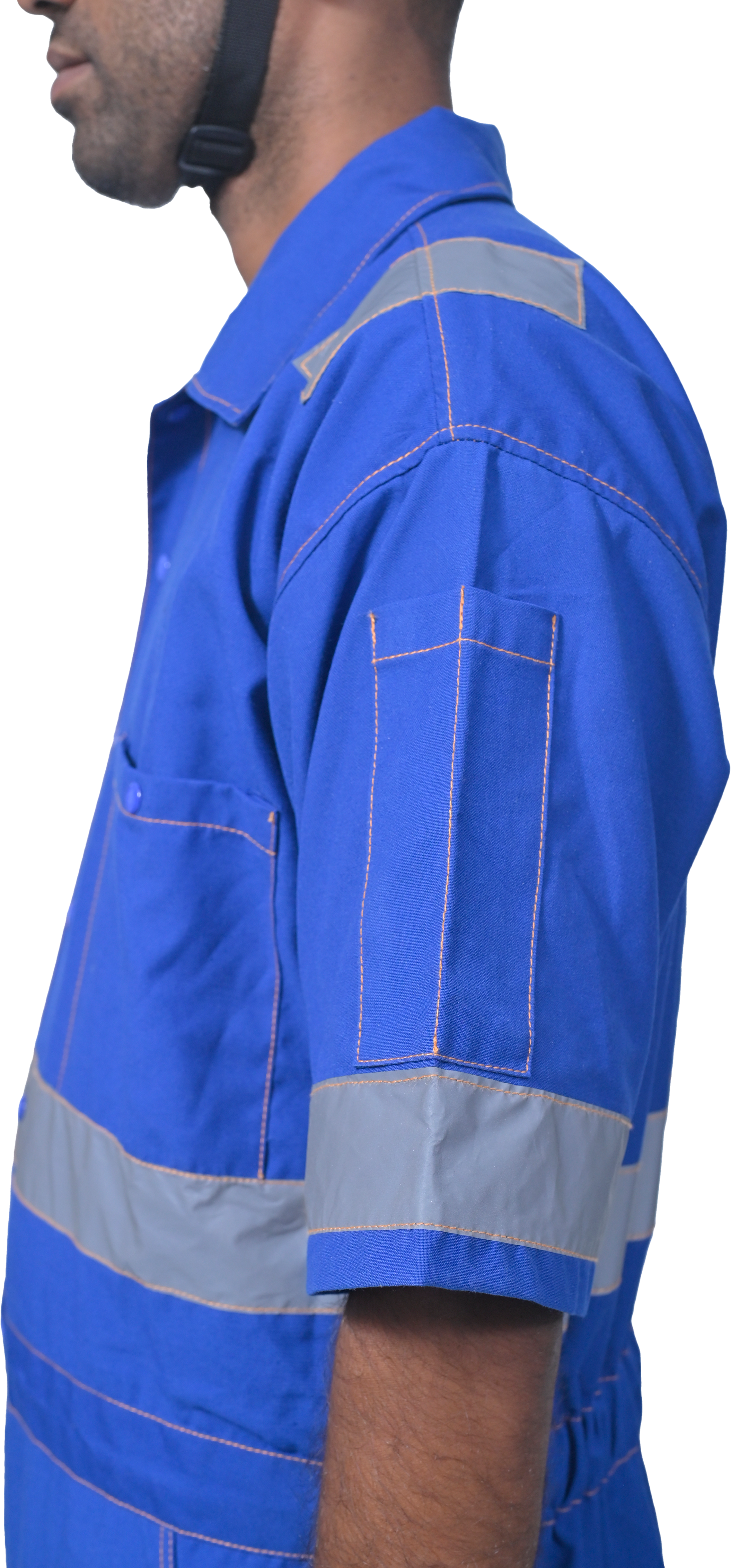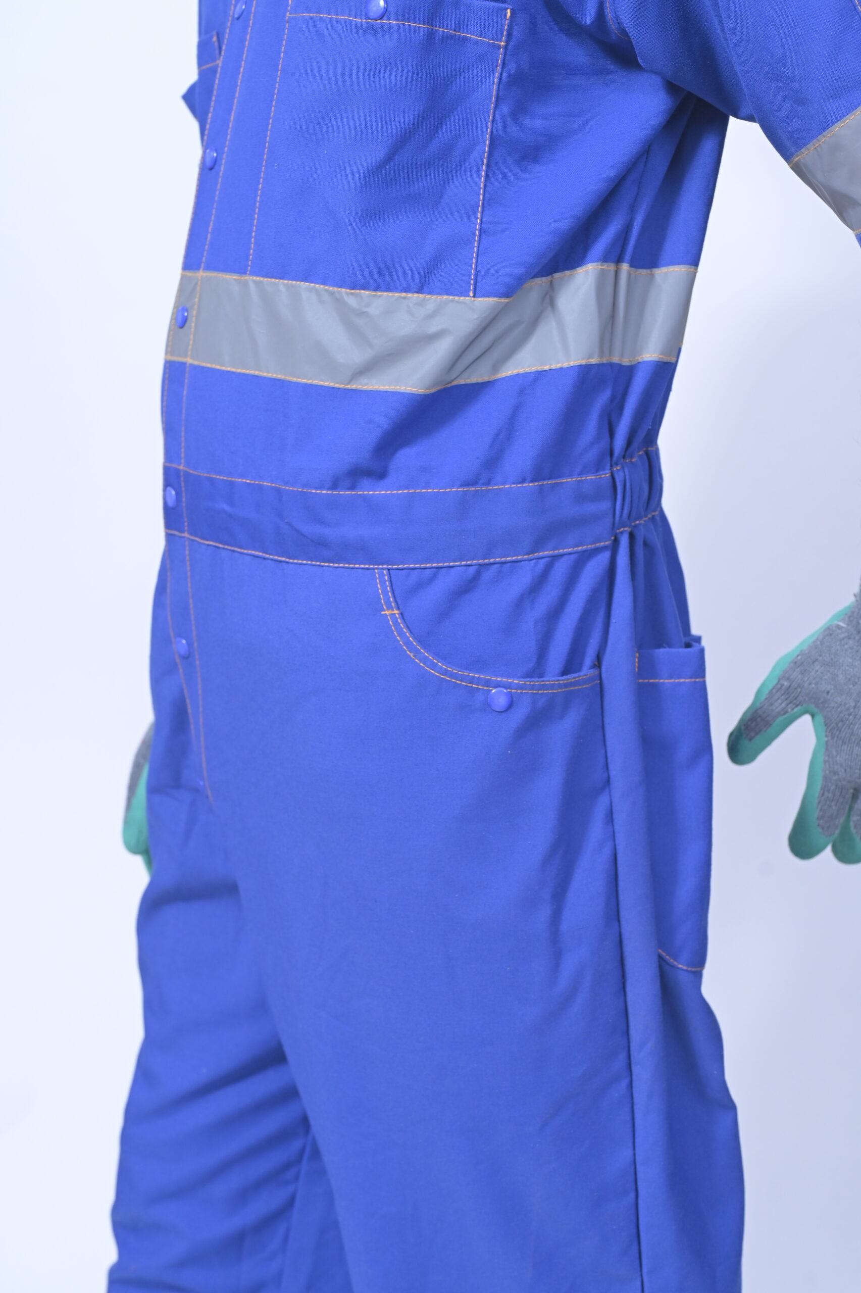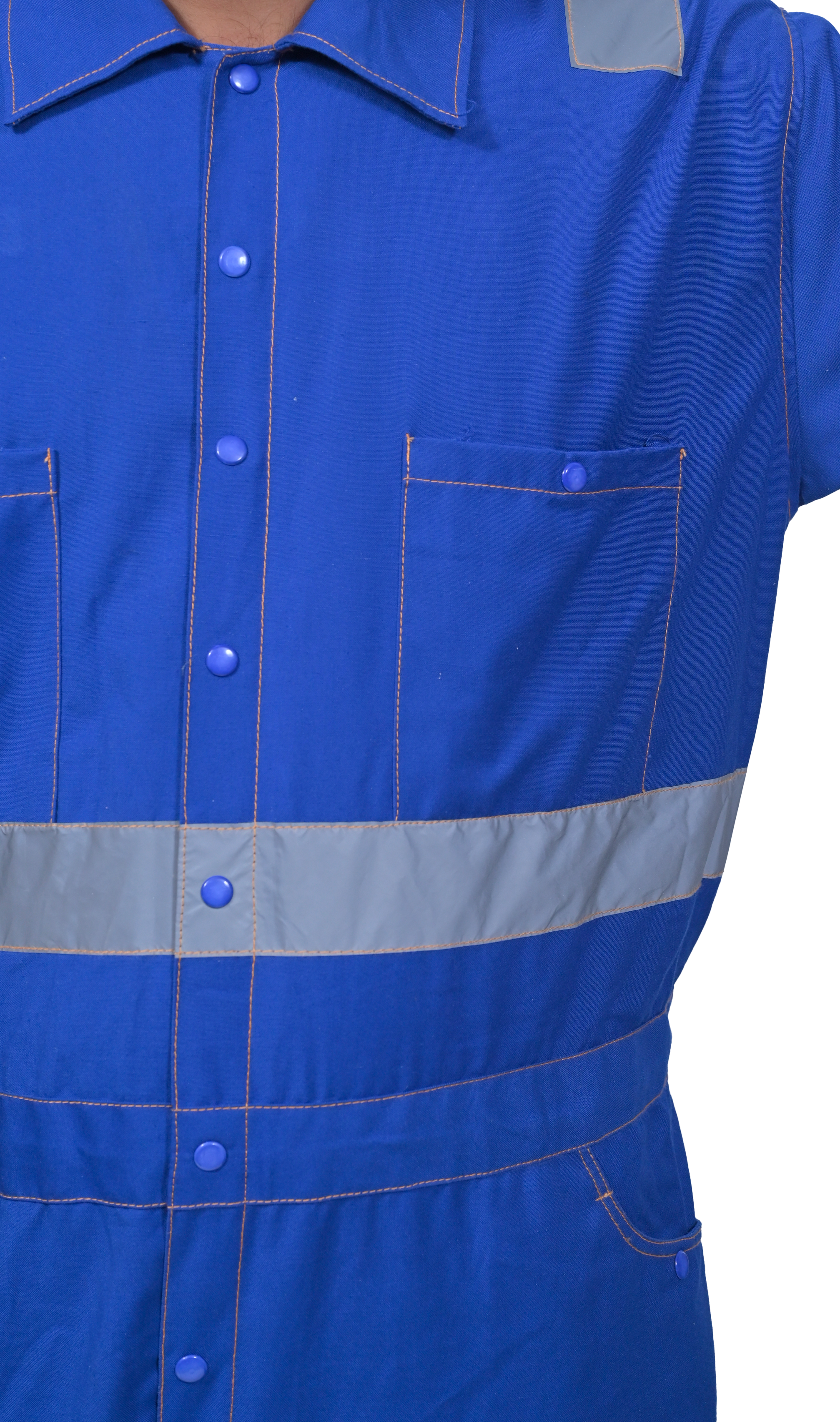 This half sleeve overall comes in single colour. It has a contrast stitching for added style. The half sleeves are a good choice for warm weather and to increase arm mobility. It can be made in polyester/cotton or 100% cotton fabric. Reflective tape is stitched on it in various patterns to increase visibility. It can be made in various colours.